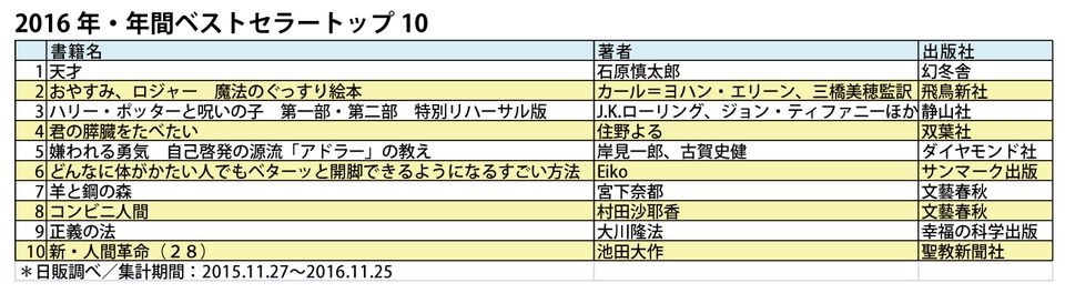 ――回答ありがとうございます。ここからはお二人に出版業界の話題についてお聞きしたいと思います。こちらは、日販調べによる2016年のベストセラーランキングなのですが、気になる本はありますか?