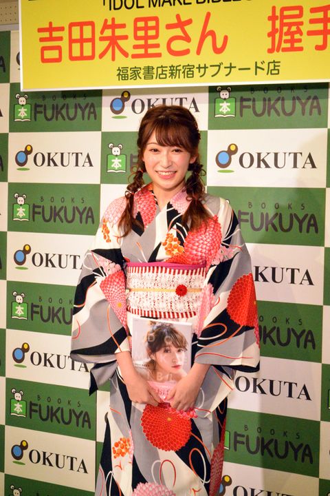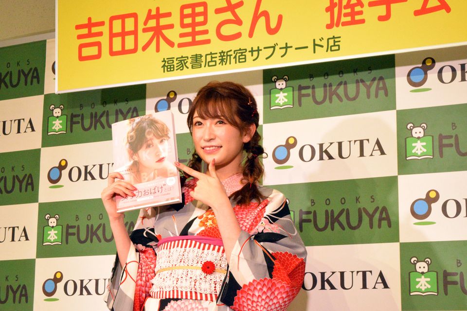 イベント前には吉田さんが、夏らしく浴衣に身を包んで登場し、取材陣に向けて「500点満点です!」と本をアピールした。