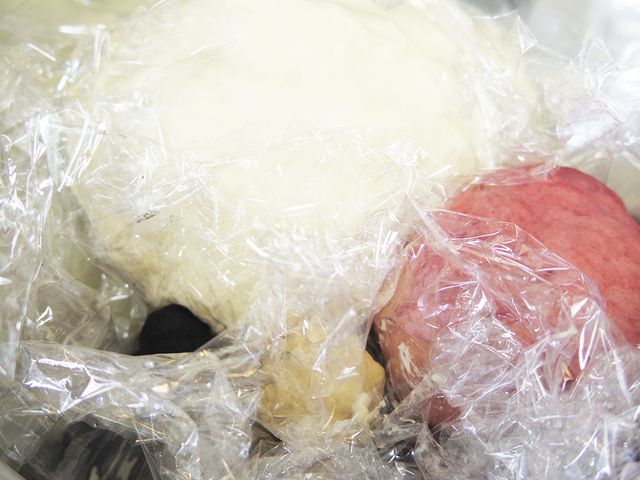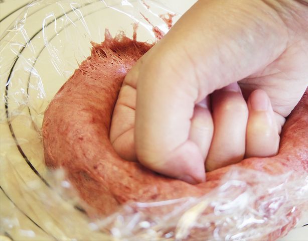 着色したものを丸めて綴じ目を下にし、ボウルに入れたらオーブンに入れて一次発酵をさせます。